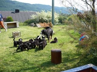 Die Zeit vergeht schnell, wir sind jetzt schon 7 Wochen alt und wiegen um die 7 kg. Wir haben schon einiges erlebt, Gewitter mit Blitz und Donner, Hagel, Düsenjäger, Rasenmäher usw.